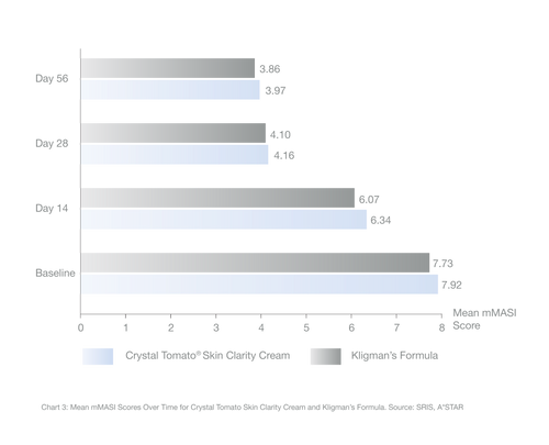 In a split-face clinical trial conducted by the Skin Research Institute of Singapore (SRIS, A*STAR), Skin Clarity Cream delivered results comparable to the gold-standard prescription treatment, with visible improvements in pigmentation at Day 14, Day 28, and sustained through Day 56.